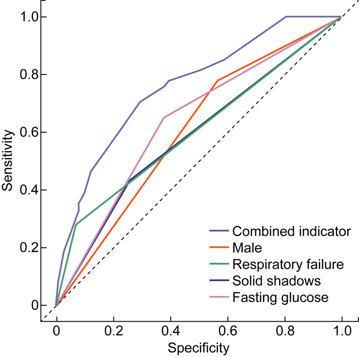1.4 统计学方法应用SAS 9.4处理数据,计量资料用x±s表示,计数资料用n(%)表示。多因素分析采用Logistic多元回归分析,当P<0.05时认为差异有统计学意义。绘制受试者特征曲线(receiver operating characteristic curve, ROC curve),并计算曲线下面积(area under the curve, AUC),分析各指标评估患者预后的临床价值。ROC曲线以假阳性率(1-特异度)为横轴,以真阳性率(灵敏度)为纵轴,本研究中,以是否感染肺炎克雷伯菌作为因变量,选取Logistic多元回归分析有显著意义的因素作为自变量,包括:是否男性、是否发生呼吸衰竭、肺部是否出现实变影、空腹血糖是否过高(≥6.1 mmol/L)。同时,以是否感染肺炎克雷伯菌为因变量,以前述4个变量的联合因素为自变量,构建联合预测模型,绘制联合指标的ROC曲线。AUC值越大,预测准确率越高。AUC<0.6时提示该因素的临床预测价值较差,0.6≤AUC≤0.9时提示具有一定的临床价值,AUC>0.9时提示该因素的临床预测价值较好。