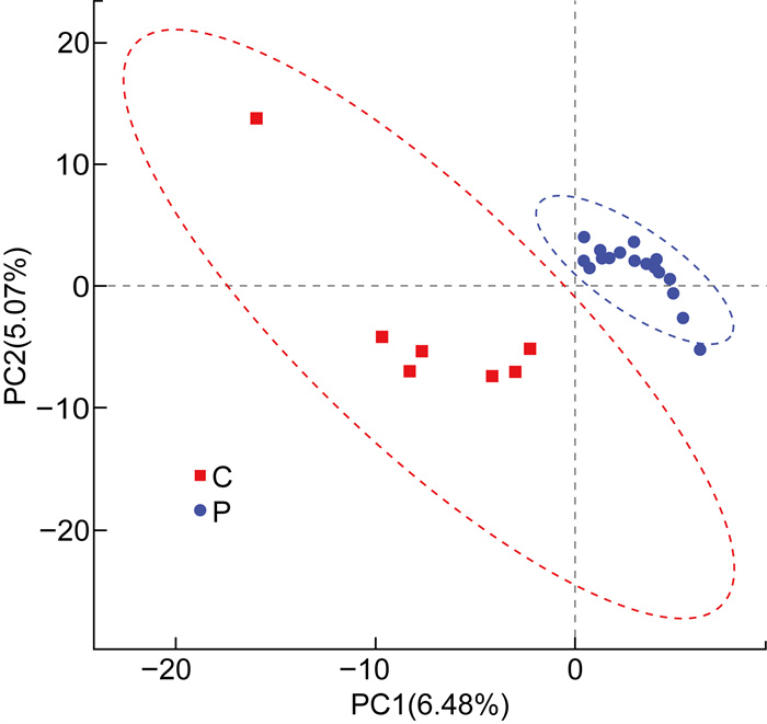 横、纵坐标分别代表对两组样本菌群组成发生偏移的疑似影响因素,C组(红色)和P组(蓝色)的粪便样本各自聚集且完全分离,即2组菌群结构存在显著差异(见图 4)。