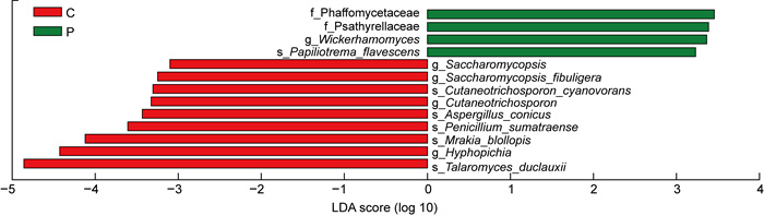 LEfSe分析用于发现2组样本中有显著差异的物种(即biomaker)以及这些特征对组间差异的影响程度。本文将LDA score阈值设定为3,柱状图的长度代表biomaker影响程度的大小。结果显示,LDA score>3的biomarker共13种,P组(绿色)丰度较高的biomarker为法夫酵母科(Phaffomycetaceae)、鬼伞科(Psathyrellaceae)、威克汉姆酵母菌属(Wickerhamomyces)、Papiliotrema_flavescens;C组(红色)丰度较高的biomarker为复膜孢酵母属(Saccharomycopsis)、扣囊复膜酵母种(Saccharomycopsis fibuligera)、Cutaneotrichosporon_cyanovorans、毛孢子菌属(Cutaneotrichosporon)、圆锥曲霉种(Aspergillus_conicus)、苏门答腊青霉种(Penicillium sumatraense)、木拉科酵母种(Mrakia blollopis)、丝孢毕赤氏酵母属(Hyphopichia)、杜氏篮状菌种(Talaromyces_duclauxii)(见图 5)。