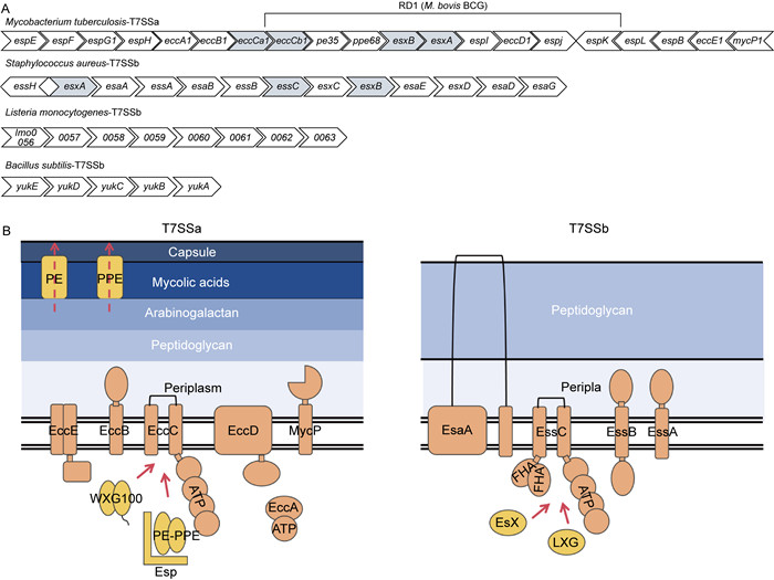 细菌的分泌系统参与细菌的物质运输,它通过将不同功能的效应蛋白转运出胞,在细菌的生存、致病性及菌群与宿主的相互作用等方面具有重要作用。迄今为止,已发现9种细菌分泌系统类型(T1SS~T9SS)。其中,T7SS是目前唯一的仅被发现存在于革兰氏阳性细菌中的分泌系统。它的发现源于对致病性结核分枝杆菌的研究。1995年,Andersen及其同事[1]从结核分枝杆菌的培养滤液中分离鉴定出了2种不含有传统Sec或是Tat途径的典型信号肽序列的效应蛋白:6-kDa早期分泌抗原靶标(early secreted antigenic target 6, ESAT-6)和与其共分泌的伴侣蛋白10-kDa培养滤液蛋白(10-kDa culture filtrate protein, CFP-10)(后分别更名为EsxA和EsxB)。针对这2种重要蛋白的分泌方式,他们猜想并通过消减杂交实验证明了结核分枝杆菌的遗传差异区1(region of difference-1, RD1)的基因编码的蛋白构成了一种全新的蛋白质分泌系统,介导了ESAT-6和CFP-10的分泌,后将该分泌系统命名为“Ⅶ型分泌系统(type Ⅶ secretion system, T7SS)”[2]。