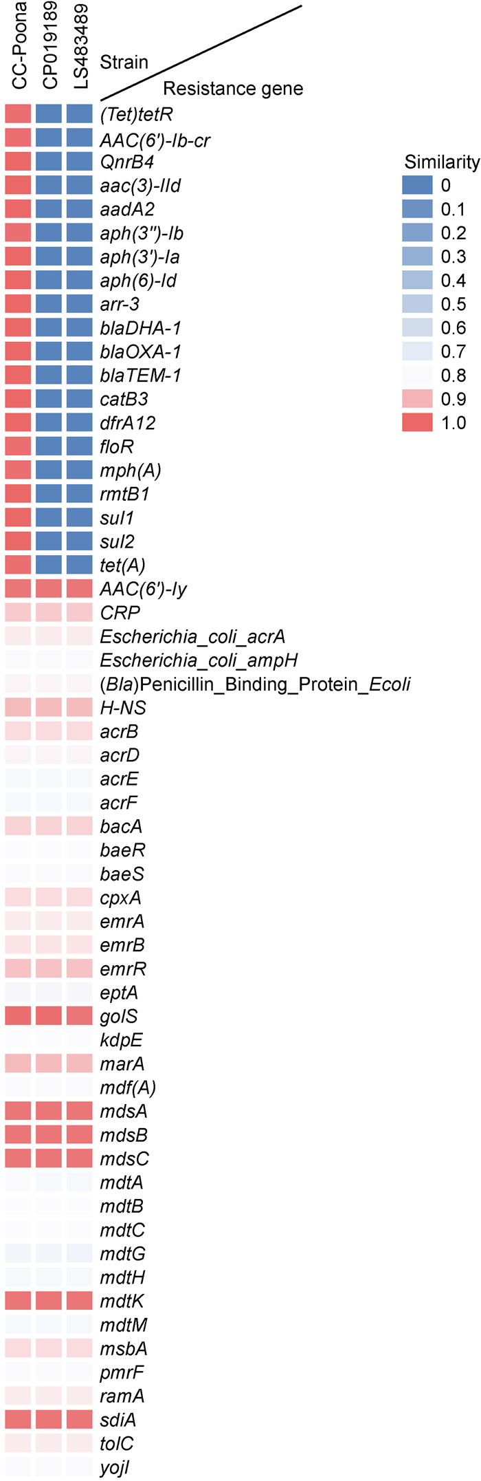 3株浦那沙门菌共筛选出58种抗性基因(见图 1),长春株(CC-Poona)比LS483489.1和CP019189.1多筛选出20种抗性基因。携带的抗性基因包括氨基糖苷类抗性基因[AAC(6′)-Ib-cr、aac(3)-IId、aph(3″)-Ib、aph(3′)-Ia、aph(6)-Id、aadA2等]、氟喹诺酮抗性基因[QnrB4、AAC(6′)-Ib-cr]、β-内酰胺类(blaDHA-1、blaOXA-1、blaTEM-1)、大环内酯类[mph(A)]、氯霉素类(catB3、floR)、磺胺类(sul1、sul2)、甲氧苄啶类(dfrA12)、利福平类(arr-3)、四环素类[tet(A)]、四环素阻遏蛋白TetR,双组分信号转导系统的组氨酸蛋白激酶基因cpxA、耐消毒剂mdf(A)、外排泵相关基因(acrB、acrD、acrE、acrF、mdsA、mdsB、mdsC、mdtA、mdtB、mdtC、mdtG、mdtH、mdtK、mdtM、tolC) 及调控基因(marA、ramA、msbA)、甲基转移酶基因rmtB1、群体感应基因sdiA。