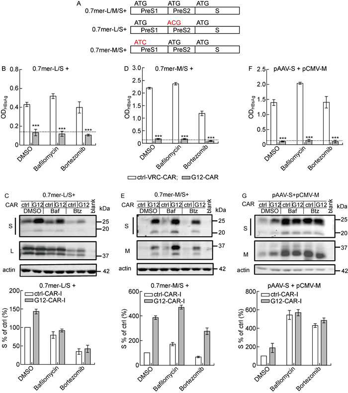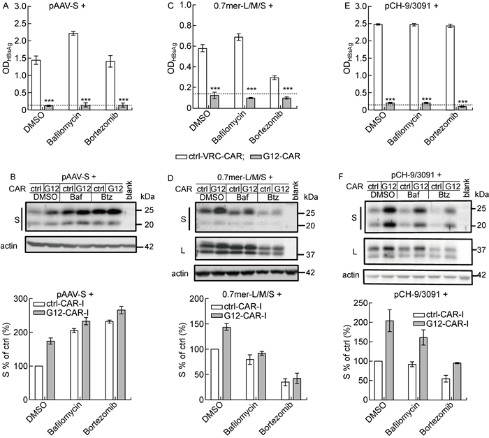 2 结果 2.1 一些乙型肝炎病毒的因素影响了S蛋白降解与本研究前期报道的工作一致[14],采用单独表达S蛋白的pAAV-S载体和表达G12-CAR的载体共转染Huh-7细胞,G12-CAR能够有效阻断HBsAg的分泌(P<0.001,见图 1A)。胞内蛋白的免疫印迹结果显示,与DMSO处理组比较,巴佛洛霉素A1和硼替佐米都显著提高了细胞内的S蛋白的水平(见图 1B),表明S蛋白可通过溶酶体和蛋白酶体2种途径降解。由于HBV表达L/M/S 3种包膜蛋白,所以本研究还将可表达这3种蛋白的0.7倍体质粒和表达G12-CAR的载体共转染至Huh-7细胞,结果显示G12-CAR仍然能有效阻断HBsAg的分泌(P<0.001,见图 1C);但是,与DMSO处理组比较,巴佛洛霉素A1和硼替佐米并不能提高细胞内的S蛋白的水平(见图 1D)。本研究使用pCH-9/3091质粒表达完整的HBV(见图 1E和1F),经过相同处理后检测胞内蛋白的表达情况,发现与DMSO处理组比较,巴佛洛霉素A1和硼替佐米同样不能提高细胞内S蛋白的水平,与仅表达L/M/S 3种包膜蛋白的情况类似。因此,这些结果提示L蛋白或M蛋白或其他病毒学因素可能影响了S蛋白通过溶酶体和蛋白酶体途径降解。