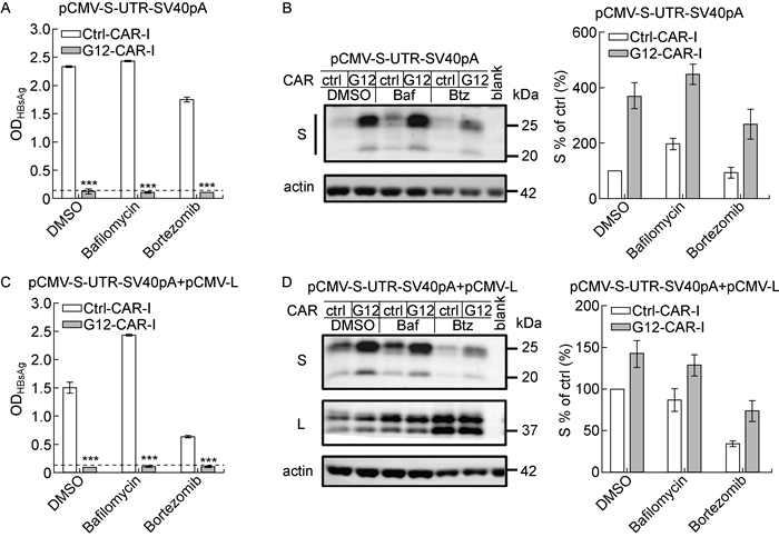 2.3 HBV基因组中包膜蛋白mRNA 3’-UTR序列影响胞内S蛋白的降解与HBV感染转录的RNA类似,0.7倍体表达质粒转录的病毒RNA包含3’-UTR序列,该序列可影响RNA的出核转运、稳定性及翻译等过程[15-16]。本研究使用包含UTR序列的S包膜蛋白表达质粒转染Huh-7细胞,再检测细胞内外包膜蛋白的水平。与上述结果一致,G12-CAR仍能够完全抑制S蛋白的分泌(P<0.001,见图 3A和3C)。免疫印迹结果显示,在表达包含UTR序列的S包膜蛋白表达质粒的Huh-7细胞中,与DMSO处理组比较,巴佛洛霉素A1处理可使胞内S蛋白水平升高,但硼替佐米并不能使胞内S蛋白水平升高(见图 3B)。这一结果提示3’-UTR干扰了S蛋白通过蛋白酶体通路的降解。而当与L蛋白表达质粒共转染时(见图 3D),与DMSO处理组比较,巴佛洛霉素A1和硼替佐米处理都不能使胞内S蛋白水平升高。这一结果进一步证明L蛋白对S蛋白通过溶酶体通路降解具有一定的影响。